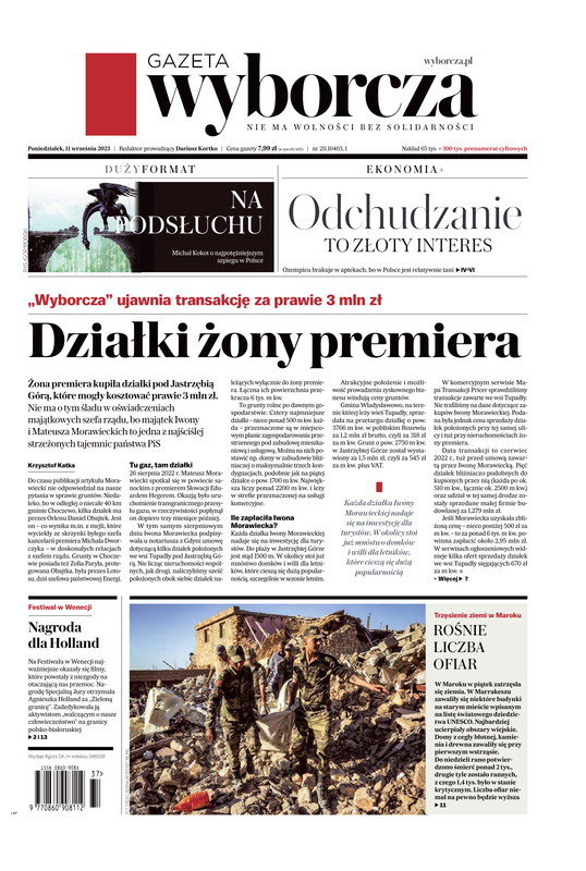 Żona premiera kupiła działki pod Jastrzębią Górą, które nadają się na inwestycję dla turystów i mogły kosztować prawie 3 mln zł. Do plaży jest stąd 1500 metrów. Nie ma śladu tego zakupu w oświadczeniach majątkowych szefa rządu, bo majątek Iwony i Mateusza Morawieckich to jedna z najściślej strzeżonych tajemnic państwa PiS.