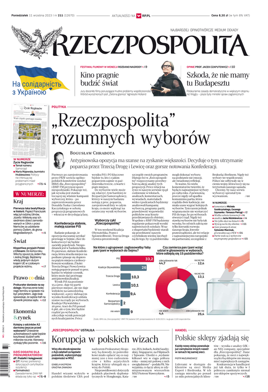 Pierwszy po zarejestrowaniu sześciu ogólnopolskich komitetów sondaż IBRiS dla ?Rzeczpospolitej? i RMF FM przynosi spore niespodzianki. Antypisowska opozycja ma szanse na zyskanie wie?kszos?ci. Decyduje o tym utrzymanie poparcia przez Trzecia? Droge? i Lewice? oraz gorsze notowania Konfederacji ? pisze Bogusław Chrabota, zapowiadając jednocześnie rozpoczęcie przez ?Rz? akcji analizy propozycji programowych ugrupowań startujących w wyborach.