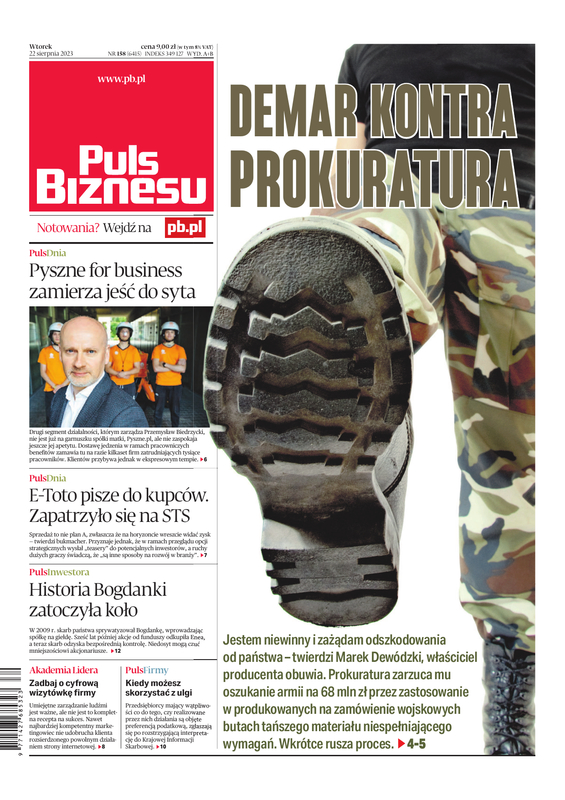 Jestem niewinny i zażądam odszkodowania od państwa ? twierdzi Marek Dewódzki, właściciel producenta obuwia. Prokuratura zarzuca mu oszukanie armii na 68 mln zł przez zastosowanie w produkowanych na zamówienie wojskowych butach tańszego materiału niespełniającego wymagań. Wkrótce rusza proces.