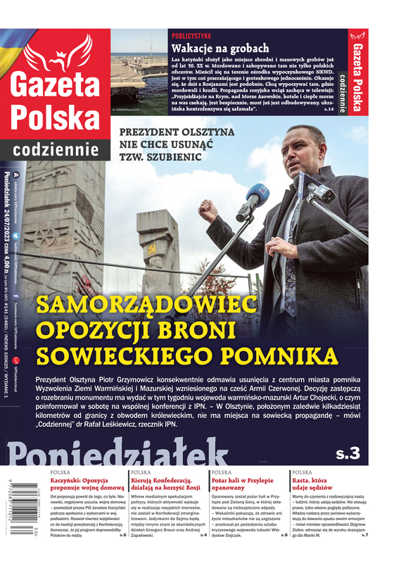 Prezydent Olsztyna Piotr Grzymowicz odmawia usunięcia z centrum miasta pomnika Wyzwolenia Ziemi Warmińskiej i Mazurskiej wzniesionego na cześć Armii Czerwonej. Decyzją zastępczą ma wydać w tym tygodniu wojewoda. ? W Olsztynie, położonym zaledwie kilkadziesiąt kilometrów od granicy z obwodem królewieckim, nie ma miejsca na sowiecką propagandę ? mówi rzecznik IPN Rafał Leśkiewicz.