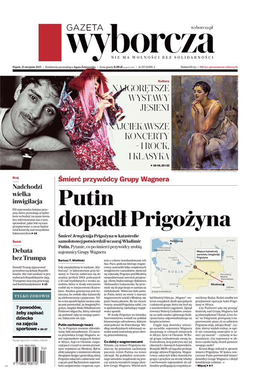 Szef Grupy Wagnera Jewgienij Prigożyn był jednym z dziesięciu pasażerów samolotu Embraer, który rozbił się w rosyjskim obwodzie twerskim - podały rosyjskie media. Oprócz niego na pokładzie miał znajdować się jego zastępca Dmitrij Utkin. Pierwsze hipotezy mówią o zestrzeleniu maszyny przez rosyjską obronę przeciwlotniczą.