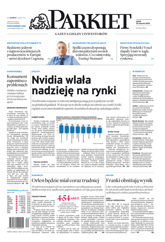 Oczekiwania związane ze sztuczną inteligencją mogą jeszcze podsycać zwyżki na globalnych giełdach. Wskazuje na to choćby reakcja inwestorów na wyniki Nvidii. Spółka, zaliczana do grona amerykańskich gigantów technologicznych, wypracowała 2,70 dol. zysku na akcję za drugi kwartał, podczas gdy średnio prognozowano, że ów wynik wyniesie 2,09 dol. Akcje Nvidii zyskiwały więc na początku czwartkowej sesji 4,8 proc. i stały się rekordowo drogie.