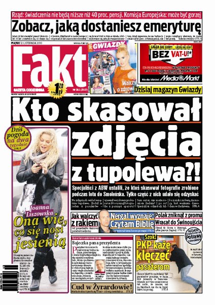 Specjaliści z ABW ustalili, że ktoś skasował fotografie zrobione podczas lotu do Smoleńska prezydenckiego Tu-154, tylko część z nich udało się odzyskać; Nergal, śmiertelnie chory wokalista zespołu Behemoth, wyznaje, że czyta Biblię; Joanna Liszowska wie, jakie ciuchy powinno się nosić, aby modnie wyglądać; PKP każe klęczeć pasażerom, aby mogli kupić bilet; zaginął Polak, który płynął promem z Norwegii do Polski.