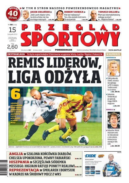 Manuel Arboleda uznawany jest za najlepszego obrońcę ekstraklasy; Kolejorz odniósł pierwsze ligowe zwycięstwo z Bakero jako szkoleniowcem; po wygranej z Legią przed Wisłą Kraków rysują się ciekawe perspektywy; na Leo Messiego napastnika nie ma siły – strzelał gole w siedmiu ostatnich meczach Barcelony; polskie siatkarki wygrały dwa mecze i zakończyły mundial na 9. miejscu; Sebastian Vettel jest drugim Niemcem, który wywalczył tytuł mistrza świata w F1; kontuzjowana Agnieszka Radwańska nie porzuciła myśli o Australian Open.