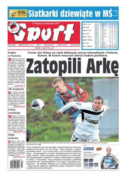 Trener Jan Urban na razie dokonuje rzeczy niezwykłych z Polonią Bytom – w trzech meczach zebrał siedem punktów; po 632 minutach bez straty gola na własnym stadionie, Seweryn Kiełpin skapitulował; kolejny dobry mecz w wykonaniu Łukasza Fabiańskiego, którego Arsenal awansował na drugie miejsce w tabeli; po 36 latach polskie siatkarki znów znalazły się w czołowej dziesiątce świata; tylko Sylwia Gruchała i jej koleżanki z drużyny przywiozą medal mistrzostw świata; Marlies Schild i Jean–Baptiste Grange znów wygrywają w Pucharze Świata; Sebastian Vettel został najmłodszym mistrzem świata w historii F1.
