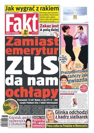 Jolanta Kwaśniewska tańczy z Janem Klimentem; Małgorzata Glinka odchodzi z kadry siatkarek; przywódcy z toporami w rękach – tak szef rządu wyobraża sobie szefów opozycji; jeśli chcemy mieć godną emeryturę, musimy pracować jak najdłużej; 60 procent z nas żyje z dnia na dzień, a w takiej sytuacji bardzo łatwo wpaść w pętlę zadłużenia; palacze kurzą bez przeszkód w miejscach publicznych; Rafał Maserak w kolejce do odprawy na lotnisku cały czas przytulał i całował swoją ukochaną; Edyta Górniak spędzi sylwestra z byłym mężem; Paweł Brożek chciałby strzelać więcej goli w kadrze; gwiazdor warszawskiej Polonii odzyskał po sobotnim meczu zaufanie szefa klubu.