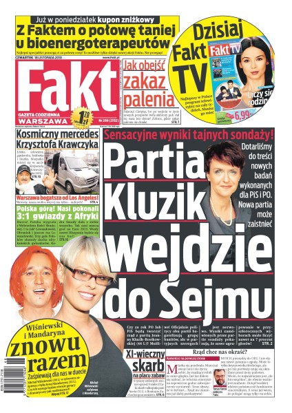 Czy za rok PO lub PiS będą tworzyć rząd z partią Joanny Kluzik–Rostkowskiej; w niedzielnych wyborach zapewnimy ciepłe posadki i przywileje prawie 47 tysiącom osób, których jedynym obowiązkiem będzie siedzieć na sali obrad; Krzysztof Krawczyk jeździ na koncerty w luksusowych warunkach; Agnieszka Szulim nie jest stojakiem pod mikrofon; po ośmiu meczach bez wygranej reprezentacja Polski pokonała Wybrzeże Kości Słoniowej 3:1; żona piłkarza Legii Bruno Mezengi będzie grała w Polsce w siatkówkę; wiadomo już, jak będą wyglądać maskotki UEFA EURO 2012, ale ich imiona piłkarscy kibice poznają później.