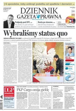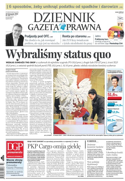 Jakie są sposoby, żeby uniknąć podatku od spadków i darowizn; jak ZUS liczy świadczenie z tytułu niezdolności do pracy; według sondażu TNS OBOP w wyborach do sejmików wygrała PO (33,8 proc.), drugie było PiS (27 proc.), trzeci SLD (15,8 proc.), a ostatnie spośród dużych partii PSL; zamiast na giełdzie drugi co do wielkości towarowy przewoźnik w Europie zostanie sprzedany inwestorom finansowym lub branżowym; od stycznia będzie trudniej o kredyt w ramach programu „Rodzina na swoim” i o kredyt walutowy; rząd może nie zdążyć z zapowiadanym wprowadzeniem od 1 stycznia 2011 r. ograniczeń w odliczeniu VAT od aut i paliwa.