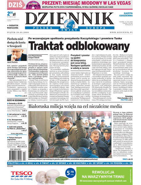 Lech Kaczyński i Donald Tusk coraz bliżej porozumienia w sprawie traktatu; powiązania Jacka Piechoty z Peterem Voglem; poradnik - pożyczki przez Internet; obietnice wyborcze McCaina; białoruska milicja aresztowała dziennikarzy; najnowsza powieść Józefa Hena; analiza porażki z USA; dwie Polki w II rundzie Sony Ericsson Open; Carla Bruni podbiła serca Brytyjczyków.
