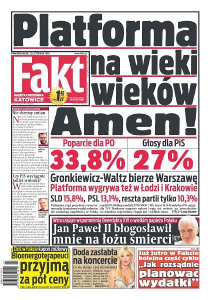 Partia Donalda Tuska wciąż numerem jeden na scenie politycznej, a PiS Jarosława Kaczyńskiego skazany na bycie w opozycji; wolny czas Donald Tusk poświęcił ukochanej piłce i rodzinie; wzruszające wspomnienia papieża Benedykta XVI; skandal w Komendzie Miejskiej Policji we Wrocławiu; Marek Kondrat wrócił filmu; Doda zasłabła na koncercie; Edyta Górniak odpadła z „Tańca z Gwiazdami”; Kamil Grosicki poprowadził zespół z Białegostoku do zwycięstwa nad słabiutką drużyną Cracovii; Skowrońska już nie zagra u Matlaka; Justyna Kowalczyk powoli się rozkręca.