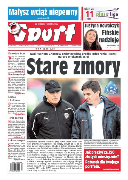 Nad Ruchem Chorzów znów zawisła groźba odebrania licencji na grę w ekstraklasie; grupa Lotos zostanie nowym sponsorem piłkarzy Lechii; hokeiści Zagłębia Sosnowiec dostali wczoraj część zaległych pieniędzy i dziś pojadą na mecz do Krynicy; Łukasz Kubot i Oliver Marach przegrali z Maheshem Bhupathi z Indii i Białorusinem Maksem Mirnym; Louis van Gaal może postawić dziś na Francka Ribery’ego, który wraca do gry po kontuzji; Justyna Kowalczyk jest już w Finlandii i wcale nie martwi się wysoką formą Marit Bjoergen.