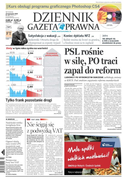 Będzie można się leczyć za granicą, a fundusz musi za to zapłacić; PSL rośnie w siłę, PO traci zapał do reform; polska waluta powinna się umocnić do końca roku; Wywiad Skarbowy będzie mógł podsłuchiwać przedsiębiorców i podatników swobodniej niż policja i służby specjalne gangsterów; nowe stawki VAT, które będą obowiązywać od przyszłego roku, w minimalnym stopniu przełożą się na ceny; amerykański UGI, rosyjski Novatek oraz Gaspol, należący do holenderskiego SHV, mają ochotę na przejęcie gazowych aktywów Orlenu oraz BP Polska; bony towarowe, które pracodawcy przekazują pracownikom, nie podlegają opodatkowaniu VAT.