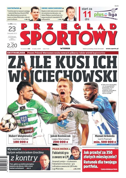 Niewykluczone, że Jakub Rzeźniczak niebawem zmieni Legię na Polonię; wywiad ze Zbigniewem Drzymałą, byłym właścicielem Groclinu Grodzisk Wlkp.; Grupa Lotos zostanie sponsorem strategicznym lechitów – budżet klubu wzrośnie do ponad 25 milionów złotych; rośnie zainteresowanie innych klubów Marcinem Robakiem; Jose Mourinho oszczędza piłkarzy na Gran Derbi; aż 12 goli w ostatnich dziewięciu meczach Bayernu strzelił Mario Gomez; mistrzowie Anglii mogą przegrać mistrzostwo przez brak klasowych zmienników; czy Vive Targi Kielce ma jeszcze szansę na wyjście z grupy; nowy skrzydłowy mistrza Polski Asseco Prokomu Gdynia próbuje zastąpić byłą gwiazdę.