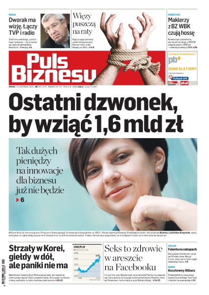 Polska Agencja Rozwoju Przedsiębiorczości, którą kieruje Bożena Lublińska–Kasprzak, wyda pieniądze na najbardziej popularne e–dotacje oraz na dofinansowanie badań; nieobliczalni władcy Korei Północnej sprawili, że inwestorzy znów zaczęli się bać; media mogą dostać nawet 1,5 mld zł z abonamentu – szacuje szef Krajowej Rady Radiofonii i Telewizji; Ministerstwo Gospodarki obiecuje kolejny pakiet deregulacyjny w 2011 r.; firma Bosch będzie we Wrocławiu produkowała ceramiczne filtry cząstek stałych do silników Diesla; Facebook przestraszył się golizny na fanpage’u farmaceutycznej firmy; inwestorzy obawiają się, że kłopoty Irlandii sygnalizują kolejną falę kryzysu.