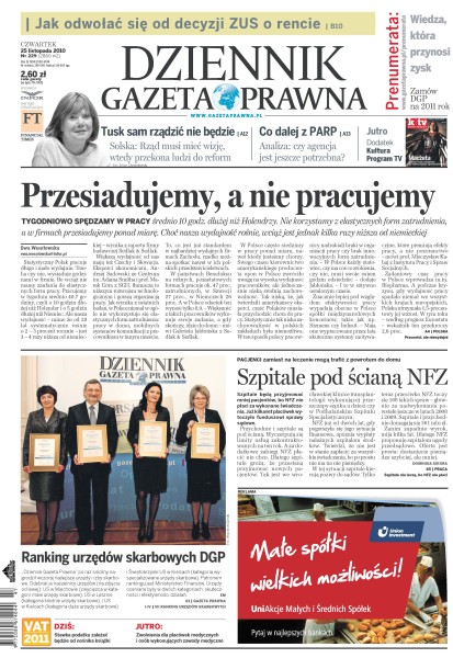 Jak odwołać się od decyzji ZUS o rencie; tygodniowo spędzamy w pracy średnio 10 godz. dłużej niż Holendrzy, nie korzystamy z elastycznych form zatrudnienia, a w firmach przesiadujemy ponad miarę; szpitale będą przyjmować mniej pacjentów, bo NFZ nie płaci za wykonane świadczenia; PSL grozi, że razem z opozycją może wstrzymać ustawę o finansach publicznych; powitanie nowego roku w górach kosztuje średnio 10 proc. więcej niż rok temu; rząd wprowadza drastyczne cięcia: obniży pensję minimalną, zredukuje świadczenia dla osób, które długo pozostają bez pracy, wprowadzi podatek od nieruchomości i zmniejszy ulgi w PIT.
