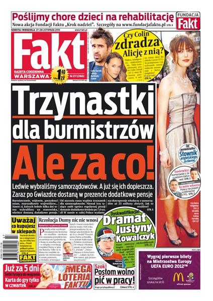 Trzynastki dla burmistrzów – ledwie ich wybraliśmy, a już się ich dopieszcza; rosyjska Duma uchwaliła rezolucję, że Katyń to zbrodnia ZSRR z rozkazu Stalina; dlaczego posłom wolno pić w pracy i nie można ich za to w żaden sposób ukarać; poseł Palikot opowiada o początkach kłopotów w PiS; prezydent Komorowski zawsze znajdzie czas dla swojej mamy; uważaj, co kupujesz: przed świętami półki uginają się do „wynalazków”; mikołajkowy poradnik dla rodziców; z kim Colin Farrell zdradza Alicję Bachledę-Curuś; Justyna Kowalczyk została zdyskwalifikowana w biegu stylem klasycznym; piłkarze Cracovii walczyli do końca i w kilka minut odwrócili losy meczu; Mariusz Fyrstenberg i Marcin Matkowski są rewelacją tenisowego turnieju Masters w Londynie.