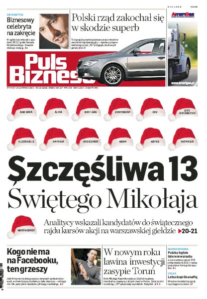 Analitycy wskazali kandydatów do świątecznego rajdu kursów akcji na warszawskiej giełdzie; jeśli firma nie ma silnej pozycji w serwisach społecznościowych, w chwili kryzysu może ucierpieć podwójnie; Toruń wyda na inwestycje w 2011 roku najwięcej z dużych miast w Polsce; Skoda Superb to najczęściej wykorzystywany przez ministrów samochód reprezentacyjny; w sądzie leży wniosek o upadłość MCSI, spółki Konrada Wojterkowskiego, inwestor obiecuje, że zrobi wszystko aby ocalić firmę.