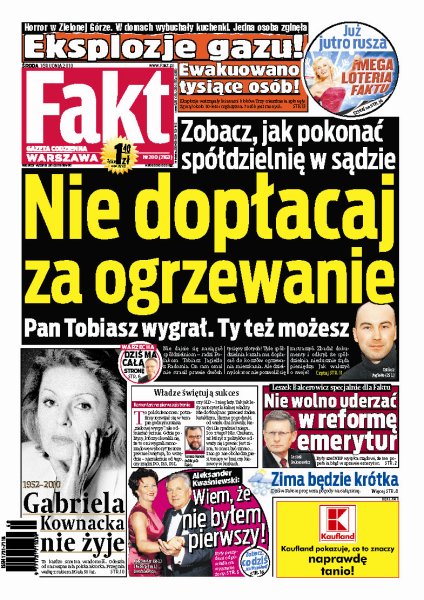 Gabriela Kownacka, znana i lubiana aktorka filmowa i serialowa, przegrała walkę z nowotworem, odeszła mając zaledwie 58 lat; były prezydent Aleksander Kwaśniewski odpowiada na szczere wyznanie swojej żony; Leszek Balcerowicz ostrzega, że nie wolno uderzać w reformę emerytalną; zobacz, jak skutecznie walczyć w sądzie o swoje prawa ze spółdzielnią mieszkaniową; horror w Zielonej Górze, w wyniku wybuchu gazu spłonęły trzy mieszkania i zmarł 50-letni mężczyzna.