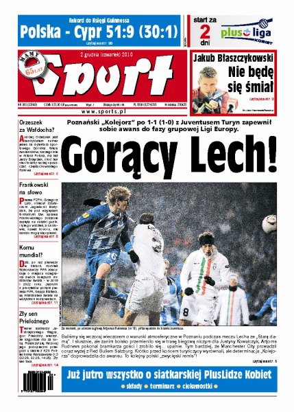 Lech Poznań zremisował na własnym stadionie z wielkim Juventusem Turyn i zapewnił sobie awans do fazy pucharowej Ligi Europy; Andrzej Orzeszek jest kandydatem numer jeden na dyrektora sportowego Górnika; prezes PZPN Grzegorz Lato obiecał działaczom Jagiellonii Białystok, że pod względem formalnym tzw. sprawa Frankowskiego zostanie zapięta na ostatni guzik; dziś po raz pierwszy w historii Komitet Wykonawczy FIFA zdecyduje o miejscu rozegrania dwóch kolejnych mistrzostw świata; Igor Prielożny, trener siatkarzy Jastrzębskiego Węgla, wierzył, że najgorsze ma za sobą, niestety przeliczył się.
