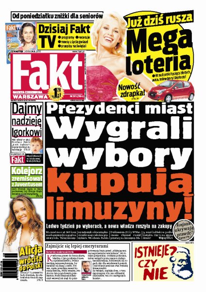 Ledwo tydzień po wyborach, a nowa władza już ruszyła na zakupy: ma moc aż 240 koni mechanicznych i napęd na cztery koła, takiej limuzyny zażyczyli sobie urzędnicy wybranego właśnie prezydenta Wrocławia Rafała Dutkiewicza; Alicja Bachleda-Curuś przyjechała do Krakowa, by odebrać złoty klucz do tego miasta; Lech Poznań zagra w fazie pucharowej Ligi Europy dzięki remisowi 1:1 z Juventusem Turyn; Rosjanie ukrywają całą prawdę w kluczowej dla Polski sprawie.