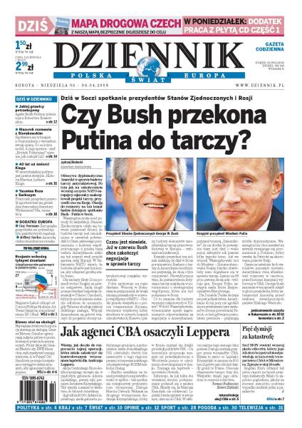 Dziś spotkanie Busha z Putinem, kulisy akcji CBA przeciw Andrzejowi Lepperowi, pięć dymisji za katastrofę CASY, sylwetka Zbigniewa Ćwiąkalskiego, "Kryminalni" schodzą ze sceny, sponsorzy wycofują się z Ekstraklasy. Jeffrey Sachs przewiduje kryzys, romantyczny niemiecki nazizm.