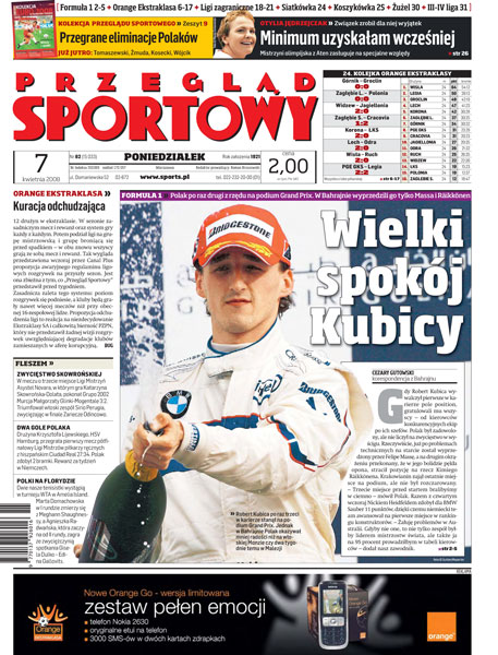 Robert Kubica po raz drugi na podium - o włos od wielkiego sukcesu; Legia-Bełchatów - emocje w końcówce meczu; ciąg dalszy problemów w Koronie Kielce; wywiad z Przemysławem Kaźmierczakiem; siatkówka - finał Pucharu Polski Kobiet; koszykówka - Prokom zdobywcą Pucharu Polski.