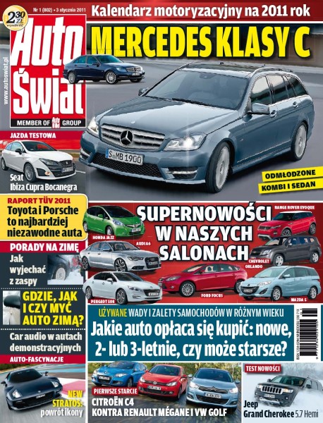 Mercedes klasy C: face lifting sedana i kombi; przegląd modeli debiutujących w salonach sprzedaży w I kwartale 2011 roku; ranking niezawodności TÜV: które samochody są najmniej awaryjne, a które najczęściej się psują; Citroën C4, Renault Mégane i Volkswagen Golf – porównanie europejskich aut kompaktowych; Seat Ibiza Cupra Bocanegra, indywidualista o sportowym zacięciu; Jeep Grand Cherokee – pierwszy test nowej generacji amerykańskiej terenówki z silnikiem V8; jak wyjechać z głębokiego śniegu i myć samochód zimą.