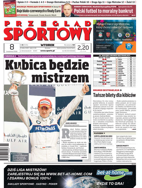 Robert Kubica jeszcze może być mistrzem; wywiad z Mario Theissenem; tańsze bilety - zadośćuczynienie kibicom za korupcję; Tomas Jirsak pokazuje klasę; zmiany w Arce Gdynia; Liverpool-Arsenal - szansa na remis.