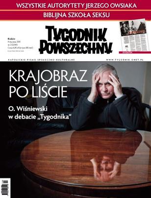 Jaki Kościół po liście o. Wiśniewskiego: „Tygodnik” przedstawia debatę zatytułowaną „Klucze do twierdzy”, w której uczestniczą o. Ludwik Wiśniewski, kierownik działu religijnego „Gościa Niedzielnego” ks. Tomasz Jaklewicz oraz ks. Adam Boniecki; rozmowa z Jerzym Owsiakiem przed finałem Wielkiej Orkiestry Świątecznej Pomocy; Piotr Zaremba: polityka na kacu, czyli jak piją posłowie i jak ich picie zmieniało się w ostatnich dwóch dekadach; czy ustawa, według której urzędnik będzie płacił z własnej kieszeni za popełnione przez siebie błędy, może tylko wydłużyć ustalenie winy urzędników; niewinna ekstaza: czego współczesnych małżonków może nauczyć biblijna Pieśń nad pieśniami; czy istnieją alternatywy dla ropy; analiza możliwych scenariuszy wydarzeń na Kubie; konsekwencje i kulisy procesu Michaiła Chodorkowskiego; nad wygodami i złudzeniami współczesnego podróżowania zastanawia się Patrycja Bukalska; o najnowszym sukcesie polskich naukowców pisze dr Anna Ochab-Marcinek, współodkrywca odkrytego mechanizmu, dzięki któremu żywe komórki mogą przekuć przypadkowość w porządek; kogo kocha Amos Oz – portret wielkiego pisarza nakreślił Grzegorz Jankowicz; wystawa braci Chapman w Polsce; wystawa prac nowojorskich ekspresjonistów abstrakcyjnych w MoMA; filozof za kamerą zwiastuje niebezpieczeństwo – czy Bruno Dumont zdobędzie w Polsce większą popularność; rozmowa z Kordian Tarasiewiczem, jednym z pionierów polskiego tenisa i właścicielem pierwszej w Polsce palarni kawy, w której wspomina Paderewskiego i Narutowicza, Osóbkę-Morawskiego i Fibaka.