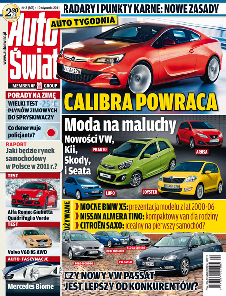 Najmniejsze nowości Volkswagena, Skody, Seata i Kii oraz nowe modele Opla – w tym auto tygodnia, planowany na 2013 rok Opel Calibra; rynek motoryzacyjny w Polsce w 2011 roku; test porównawczy: Ford Mondeo, Opel Insignia, Skoda Superb kontra Volkswagen Passat; Alfa Romeo Giulietta w topowej wersji Quadrifoglio Verde; Volvo V60 w wersji kombi z napędem 4x4; Abarth Punto Evo - najmocniejsza odmiana włoskiej „kropki”; część 8. rankingu najlepszych: stosunek masy do mocy; test zimowych płynów do spryskiwaczy; jak zachowywać się podczas kontroli przez policję; radary i punkty karne - nowe zasady; auta używane: BMW X5 (2000-06), Nissan Almera Tino (2000-05), Citroën Saxo (1996-2000).
