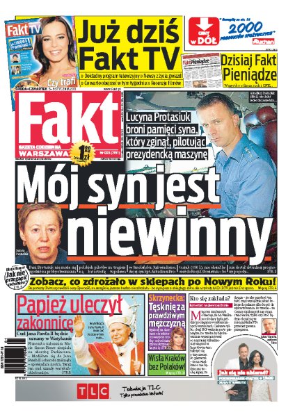 Lucyna Protasiuk broni pamięci swojego ukochanego syna, który zginął, pilotując prezydencką maszynę; zobacz, jakie towary zdrożały w sklepach od 1 stycznia tego roku; cud Jana Pawła II zostanie uznany przez Watykan; Katarzyna Skrzynecka przyznaje, że tęskni za prawdziwymi mężczyznami; dodatek, w którym znajdziesz wszystkie informacje dotyczące OFE; PKP ma różne oferty, gorsze dla zwykłych obywateli i luksusowe dla polityków.