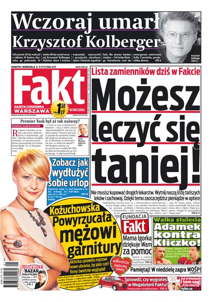 Krzysztof Kolberger, wybitny aktor i reżyser, zmarł wczoraj po prawie 20 latach walki z rakiem; lista tańszych zamienników drogich lekarstw; zobacz, jak wydłużyć sobie urlop; Małgorzata Kożuchowska powyrzucała mężowi garnitury; Tomasz Adamek kontra Władymir Kliczko – taka walka czeka nas we wrześniu na stadionie we Wrocławiu; to nieprawda, że kolejom brakuje wagonów: ponad połowa nie jeździ, bo nikt nie zrobił im przeglądów; nie daj się okraść na wyprzedażach; biegli psychiatrzy i śledczy poznali się na sztuczkach mordercy: nie będzie już udawał wariata; Alicja Resich-Modlińska wraca na wizję; gwiazdy filmu „Och, Karol 2” się nie cierpią – czy będzie draka na premierze; rozmowa z Małgorzatą Glinką; Justyna Kowalczyk stoi przed szansą na zwycięstwo w Tour de Ski.