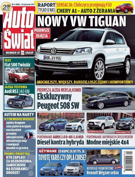 Tegoroczny face lifting Tiguana to tylko klasyczna kosmetyka; odpowiedź Audi na BMW serii 1 M: 340-konne RS3 Sportback z napędem na 4 koła; testy: Peugeot 508 SW GT 2.2 HDI, Fiat 500 TwinAir, Toyota Auris 1.8 HSD i 2.0 D-4D, Seat Leon Cupra R; zgodnie z przewidywaniami potrójne zwycięstwo w Rajdzie Dakar odnieśli kierowcy Volkswagenów Race Touaregów; najlepsze i najgorsze samochody pod względem przestronności - miejsce na nogi na tylnych siedzeniach; jakie niespodzianki mogą spotkać kierowców na drogach Europy i w kraju docelowym; kto odpowiada za dziurę w drodze; porównanie używanych Opla Corsy z Toyotą Yaris.