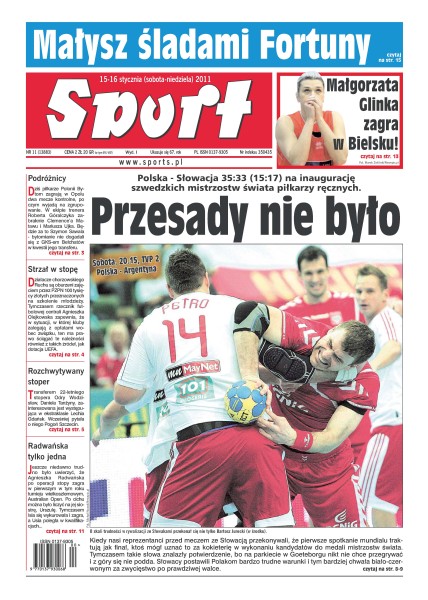 Polska – Słowacja 35:33 na inaugurację szwedzkich mistrzostw świata piłkarzy ręcznych; zimowe polowanie na piłkarzy – „Kolejorz” chce pozyskać Rafała Murawskiego; przyszłość Szymona Sawali wciąż stoi pod znakiem zapytania; długi KS Ruch Chorzów znowu dają o sobie znać; trening czyni awans u Roberta Kasperczyka; Boruc zmierzy się z rewelacją ligi, Urugwajczykiem Edinsonem Cavanim; Tottenham Hotspur podejmie niepokonany od dziewięciu miesięcy Manchester United; „Pele w spódnicy”; prezes Tomasz Baran zapewnia, że Paweł Giel nie odejdzie w tym okienku transferowym; JKH GKS Jastrzębie wciąż niepokonane w lidze; sesja treningowa w Sapporo: Małysz wylądował daleko.