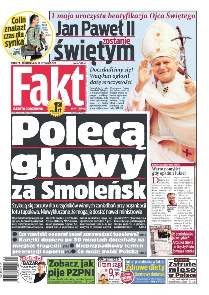 Jan Paweł II zostanie świętym; katastrofa smoleńska – szykują się zarzuty dla urzędników winnych zaniedbań przy organizacji lotu tupolewa; trujące mięso z Niemiec jest w Polsce; jak zabłysnąć na studniówce w 2011 r.; czujnik za 60 zł uratował im życie; Jacek U. planował tę zbrodnię – porwał i zabił, po czym pojechał do pracy; zaczęły się ferie; pomóż złapać gwałciciela 19-latki; smutny koniec programu Tomasza Kammela; Curuś oddała Colinowi synusia; polscy piłkarze ręczni rozpoczęli start w mistrzostwach świata od wygranej; Małysz dołożył Morgiemu.