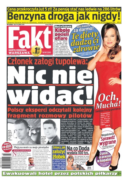 Polscy eksperci odczytali kolejny fragment rozmowy pilotów tupolewa; prezydent Bronisław Komorowski odznaczył ludzi kultury; za pensję minimalną Polak może kupić tylko 286 litrów benzyny; makabryczny mord w wojnie pseudokibiców - bandyci zadźgali maczetami herszta wrogiego gangu; jak pies służy człowiekowi; Doda wydała 100 tysięcy zł na teledysk; polscy szczypiorniści wreszcie zagrali w mistrzostwach świata w Szwecji efektownie i skutecznie.