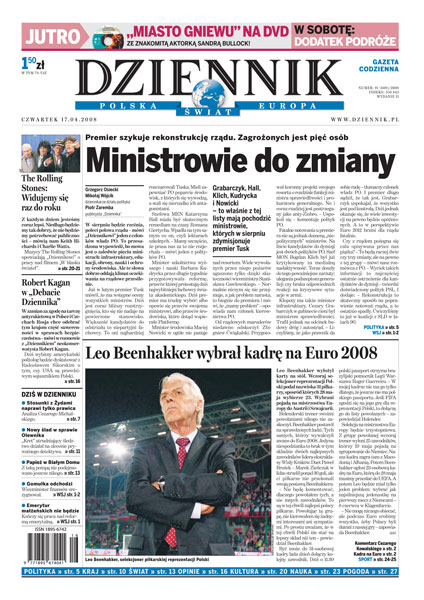 Donald Tusk szykuje rekonstrukcję rządu; Leo Beenhakker ustalił skład kadry na Euro 2008 - zaskakujące wystąpienie selekcjonera na temat korupcji i dymisji Listkiewicza; jakie jest miejsce Polski w polityce USA i kto jest głównym wrogiem Stanów - rozmowa z gościem „Debaty Dziennika”, Robertem Kaganem; naukowcy rozczarowani proponowaną reformą i spotkaniem z premierem; Elżbieta Jakubiak krytykuje przygotowania do Euro 2012; kontrowersyjne zarządzenie byłego szefa NFZ; Wielka Brytania - upada mit o polskich przestępcach; Berlusconi przeciw imigrantom; Keith Richards i Charlie Watts specjalnie dla „Dziennika”; co kryje genom; Janusz Świtaj po 16 latach na samodzielnym spacerze.