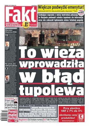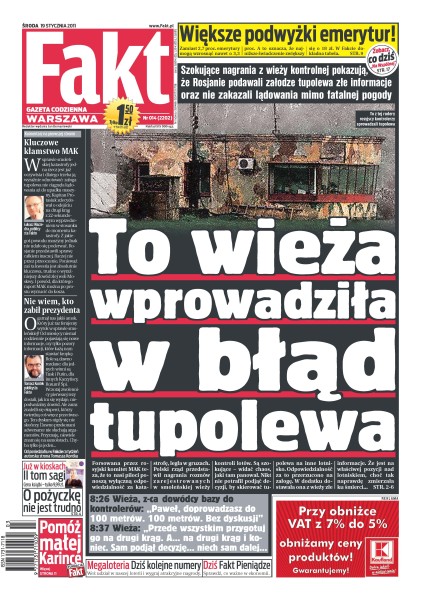 Szokujące nagrania z wieży kontrolnej pokazują, że Rosjanie podawali załodze tupolewa złe informacje oraz nie zakazali lądowania mimo fatalnej pogody; wszystko wskazuje na to, że tegoroczne podwyżki świadczeń, jakie wypłaci ZUS, będą wyższe, niż planował rząd; na uroczystości beatyfikacyjne papieża Jana Pawła II przyjedzie nawet milion osób; jak się łata dziury w Polsce; nowy show Krzysztofa Ibisza sromotnie przegrywa z konkurencją; w mistrzostwach świata piłkarzy ręcznych Polacy kroczą od zwycięstwa do zwycięstwa.