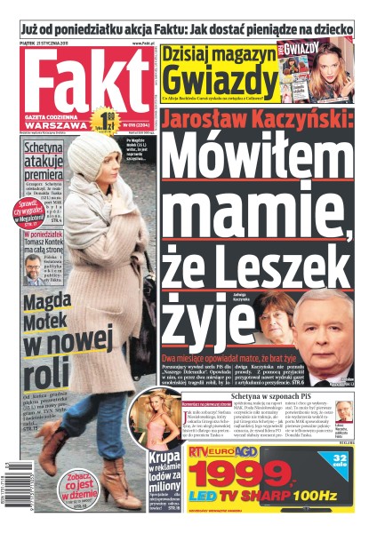 To, co odsłuchali Polacy, potwierdza, że załoga Tu-154 nie zamierzała lądować za wszelką cenę; niespodziewana krytyka marszałka Sejmu wywołała wielką burzę w Platformie; Jarosław Kaczyński ujawnia dramatyczne chwile z katastrofy; woda odcięła mieszkańców wsi nad jeziorem Gopło; jakie były pierwsze słowa narzeczonego Dody i lidera Behemotha po wyjściu ze szpitala; w ostatnim meczu grupowym mundialu piłkarzy ręcznych ulegliśmy Szwecji 21:24 i do kolejnej rundy awansujemy tylko z dwoma punktami.