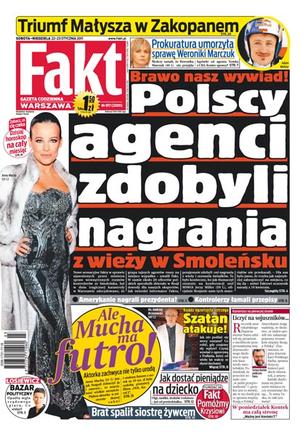 Polscy agenci zdobyli nagrania z wieży w Smoleńsku; prokuratura umorzyła sprawę Weroniki Marczuk; wywiad z księdzem-egzorcystą; włośnica zaatakowała 11 osób; brat spalił siostrę żywcem; Anna Mucha zachwyca nie tylko urodą; Katarzyna Niezgoda królową Warszawki; „Och, Karol 2” premierą roku 2011; triumf Adama Małysza w Zakopanem; mistrzostwa świata w piłce ręcznej: musimy dziś pokonać Danię; Cracovia szantażuje piłkarzy.