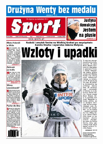 Radość i smutek fanów na Wielkiej Krokwi po pierwszym pucharowym zwycięstwie Kamila Stocha i wywrotce Adama Małysza; Polacy wrócą z mistrzostw świata w piłce ręcznej bez medali; Holender Kew Jaliens dostał propozycję podpisania 2,5-letniego kontraktu z Wisłą Kraków; Justyna Kowalczyk zajęła drugie i czwarte miejsce podczas weekendowych zawodów Pucharu Świata w estońskim Otepaeae; prawdziwa kanonada – tak można opisać pierwszy w historii polskiego hokeja Mecz Gwiazd; zobacz, jak polscy tenisiści spisują się w Australian Open.