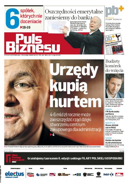 Do sześciu mld zł rocznie może zaoszczędzić rząd dzięki stworzeniu centrum zakupowego dla administracji; opracowana przez ministra Michała Boniego ulga ma wady, ale i tak zachęci dwie piąte Polaków do odkładania w III filarze; domy mediowe walczą o komórki, na rynek trafią kluczowe budżety reklamowe; FM Bank rozmawia z trzema bankami o budowie sieci partnerskiej; przedsiębiorcy budowlani tną koszty i pracują na zerowej marży; rząd przyjął projekt zmian ustawy regulującej działanie programu Rodzina na swoim.