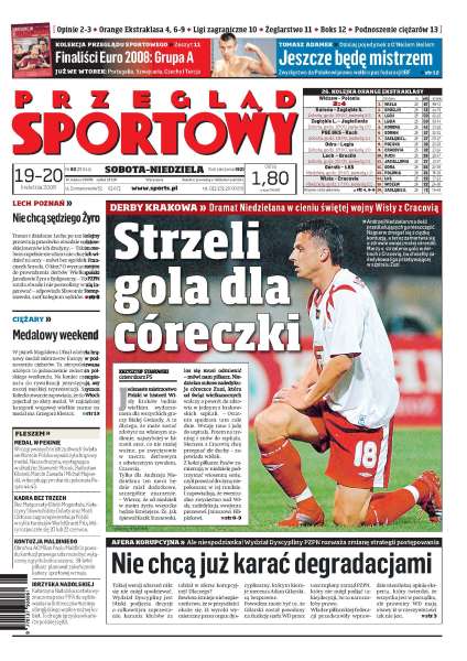 Święta wojna Wisły z Cracovią, Wydział Dyscypliny rozważa zaprzestanie karania klubów za udział w aferze korupcyjnej, Lech Poznań nie chce sędziego Żyro, 16 goli to za mało dla Beenhakkera, Ebi Smolarek o krok od Ligi Mistrzów, Mateusz Kusznierewicz i Dominik Życki mistrzami świata żeglarskiej klasy Star, wywiad z Tomaszem Adamkiem, Szymon Kołecki powalczy o złoto.