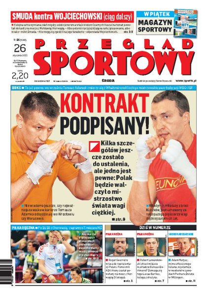 Kilka szczegółów jeszcze zostało do uzgodnienia, ale jedno jest pewne: już we wrześniu Tomasz Adamek skrzyżuje rękawice z jednym z braci Kliczków; polscy piłkarze ręczni przegrali z reprezentacją Chorwacji i są w coraz gorszej sytuacji; kolejna ostra wymiana zdań między Franciszkiem Smudą a właścicielem warszawskiej Polonii Józefem Wojciechowskim; Adam Małysz nie jest już jedyną gwiazdą w polskiej reprezentacji skoczków narciarskich.