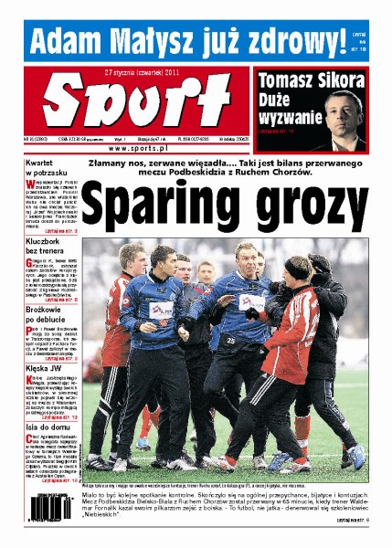 Złamany nos i zerwane więzadła – taki jest bilans przerwanego meczu Podbeskidzia z Ruchem Chorzów; alkomat, wariograf, młot i kowadło – takie rekwizyty pojawiają się w tle przygotowań reprezentacji Franciszka Smudy do Euro 2012; już w najbliższy weekend Adam Małysz będzie walczył o kolejne punkty w klasyfikacji generalnej Pucharu Świata; bracia Kliczko zgodnie podkreślają, że Tomasz Adamek to bardzo utalentowany pięściarz; Agnieszka Radwańska odpadła z Australian Open.