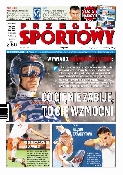 Adam Małysz, najlepszy polski skoczek narciarski, w pierwszym wywiadzie po dramatycznym upadku w Zakopanem; Tomasz Adamek będzie walczył w kwietniu z Kevinem McBride’em lub Nicolaiem Firthą; Lech Poznań pobił w zimowym sezonie transferowym finansowy rekord – na nowych zawodników wydał aż 1,83 mln zł; tegoroczna odsłona Australian Open nie sprzyja wielkim nazwiskom światowego tenisa; polscy piłkarze ręczni walczą o siódme miejsce mistrzostw świata.