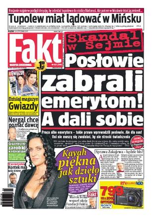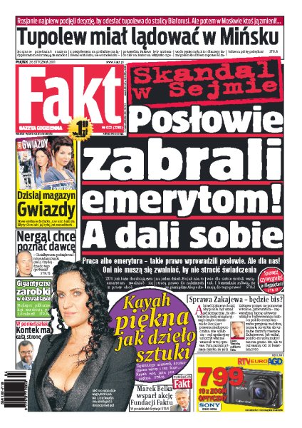 Rosjanie przekazali naszym dyplomatom informację, że prezydencki tupolew miał lądować w Mińsku a nie w Smoleńsku; posłowie zabraniają zwykłym emerytom pracować, ale sami zapewnili sobie możliwość dodatkowego zarobku; Nergal wyznaje, że chciałby poznać dawcę, dzięki któremu zyskał szansę na dalsze życie; zobacz, ile zarabiają polscy piłkarze; Kayah zachwyciła swoim wyglądem gości dobroczynnej gali.