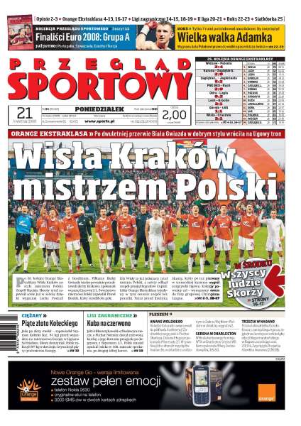 Wisła Kraków mistrzem Polski - dwa gole Pawła Brożka, czerwona kartka Jakuba Błaszczykowskiego, Michał Żewłakow mistrzem Grecji, Tomasz Adamek obił O'Neilla Bella i będzie walczył o tytuł mistrza świata, 3. kolejka Speedway Ekstraligi, piąte złoto Szymona Kołeckiego, Prokom Trefl Sopot już w półfinale play-off.