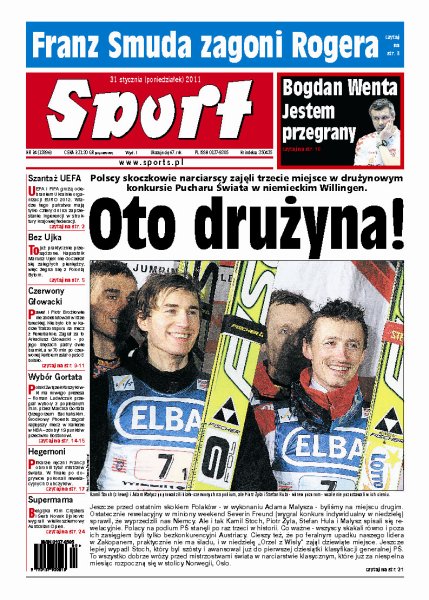 Polscy skoczkowie narciarscy zajęli trzecie miejsce w drużynowym konkursie Pucharu Świata w niemieckim Willingen; Bogdan Wenta oficjalnie przyznaje, że jego drużyna spisała się na mistrzostwach świata poniżej najgorszych prognoz; UEFA i FIFA grożą odebraniem Ukrainie praw do organizacji Euro 2012; Marcin Gortat spisuje się coraz lepiej w NBA; Agnieszka Radwańska zamiast odpoczynku po Australian Open zagra w Fed Cup.