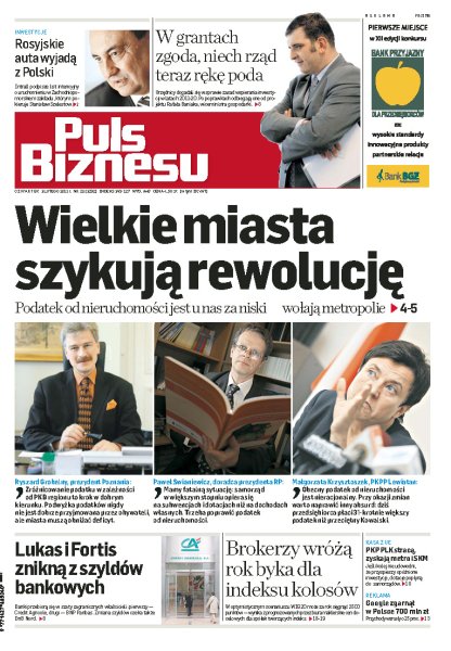 Władze największych miast domagają się podwyższenia podatku od nieruchomości; rosyjska firma Intrall podjęła decyzję w sprawie projektu, który będzie przełomem w jej inwestycjach w Polsce; najświeższe wieści dotyczące programu wspierania inwestycji w latach 2011-2020; polskie banki przejmą nazwy i logo swoich matek; zamiast PKP PLK, pieniądze z UE może dostać warszawskie metro i szybka kolej w Trójmieście.